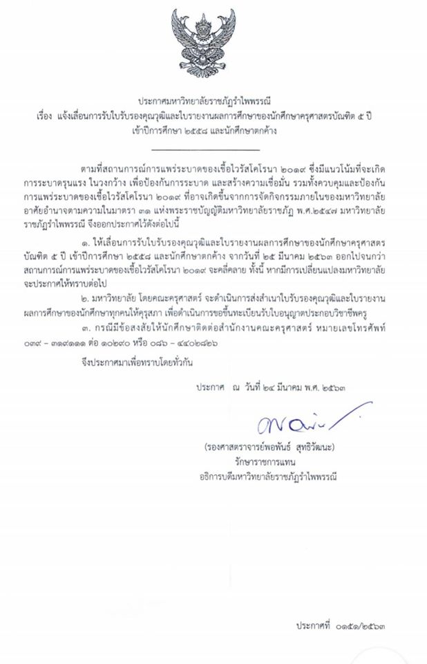 ประกาศมหาวิทยาลัยราชภัฏรำไพพรรณี เรื่อง แจ้งเลื่อนการรับใบรับรองคุณวุฒิและใบรายงานผลการศึกษาของนักศึกษาครุศาสตรบัณฑิต 5 ปี เข้าปีการศึกษา 2558 และนักศึกษาตกค้าง
