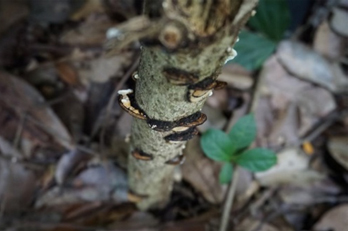 ชื่อสามัญ : - ชื่อวิทยาศาสตร์ : Melanoderma sp. แหล่งที่อยู่ : กิ่งไม้ที่ยังมีชีวิตอยู่ สถานที่เก็บตัวอย่าง : ป่าอนุรักษ์พันธุกรรมพืช มหาวิทยาลัยราชภัฏรำไพพรรณี วันที่เก็บตัวอย่าง : 11/05/64 การเจริญเติบโต : เป็นกลุ่มซ้อนกัน การใช้ประโยชน์ : เป็นผู้ย่อยสลายในระบบนิเวศ และไม่มีข้อมูลว่ารับประทานได้หรือไม่ พิกัด : เส้นทางเดินป่าบก (65 m) ฐานข้อมูลสารพันธุกรรม : https://www.ncbi.nlm.nih.gov/ Captive_Cultivated : ไม่อยู่ Accession number : รอการตีพิมพ์ ข้อมูลวงศ์เห็ด : Polyporaceae ลักษณะทั่วไป : ลักษณะหมวกเห็ดเป็นรูปใบพัด หรือครึ่งวงกลม มีสีน้ำตาลถึงสีดำ ขอบเรียบ มีขอบของดอกเห็ดจะกระดกขึ้นมาจากสิ่งที่เห็ดเจริญ เนื้อเหนียวและแข็ง ทำให้สามารถคงรูปอยู่ได้นาน บริเวณผิวจะขรุขระ ไม่มีก้าน จะเจริญโดยการแนบชิดกับพื้นที่ที่เจริญ