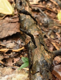 ชื่อสามัญ : เห็ดไซลาเรีย ชื่อวิทยาศาสตร์ : Xylaria allantoidea แหล่งที่อยู่ : ขอนไม้ที่ผุและไม่มีชีวิต สถานที่เก็บตัวอย่าง : ป่าอนุรักษ์พันธุกรรมพืช มหาวิทยาลัยราชภัฏรำไพพรรณี วันที่เก็บตัวอย่าง : 02/06/64 การเจริญเติบโต : เจริญเป็นดอกเดี่ยวหรือขึ้นเป็นกลุ่มเรียงตัวกันเดี่ยว ๆ การใช้ประโยชน์ : เป็นผู้ย่อยสลายในระบบนิเวศ และไม่มีข้อมูลว่ารับประทานได้หรือไม่ พิกัด : เส้นทางเดินป่าบก (120 m) ฐานข้อมูลสารพันธุกรรม : https://www.ncbi.nlm.nih.gov/ Captive_Cultivated : ไม่อยู่ Accession number : รอการตีพิมพ์ ข้อมูลวงศ์เห็ด : Xylariaceae ลักษณะทั่วไป : ลักษณะดอกเห็ดเป็นแท่งเรียว มีลักษณะคล้ายกระบองขนาดเล็ก ผิวด้ายนอกสีดำ สูง 3-5 เซนติเมตร ช่วงบนเส้นผ่านศูนย์กลาง 1-2 เซนติเมตร ผิวมีลักษณะขรุขระ เนื้อภายในในกระบองเห็ดสีขาว ใต้ปมนูนมีก้อนสีดำ ๆ รูปขวดก้นกลมฝังอยู่ในเนื้อโดยรอบ คล้ายกับเห็ด Xylaria papulis