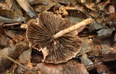 ชื่อสามัญ : เห็ดครีบคราม ชื่อวิทยาศาสตร์ : Heinemannomyces splendidissima แหล่งที่อยู่ : บนดิน สถานที่เก็บตัวอย่าง : ป่าอนุรักษ์พันธุกรรมพืช มหาวิทยาลัยราชภัฏรำไพพรรณี วันที่เก็บตัวอย่าง : 02/06/64 การเจริญเติบโต : เจริญเป็นดอกเดี่ยว การใช้ประโยชน์ : เป็นผู้ย่อยสลายในระบบนิเวศ และไม่มีข้อมูลว่ารับประทานได้หรือไม่ พิกัด : เส้นทางเดินป่าบก (100 m) ฐานข้อมูลสารพันธุกรรม : https://www.ncbi.nlm.nih.gov/ Captive_Cultivated : ไม่อยู่ Accession number : รอการตีพิมพ์ ข้อมูลวงศ์เห็ด : Agaricaceae ลักษณะทั่วไป : ลักษณะของหมวกเห็ดมีรูปทรงชามคว่ำ เนื้ออ่อน บนผิวหมวกเห็ดจะมีเกล็ดขนาดใหญ่สีน้ำตาลปลกคลุมอยู่ ครีบนั้นมีสีขาวแล้วจะมีการเปลี่ยนเป็นสีเขียวปนเทาเมื่อมีสปอร์ ใต้หมวกเห็ดที่มีสีเทาถึงสีดำจะมีกลิ่นเหม็น ส่วนก้านดอกเห็ดจะมีวงแหวน 2 ชั้น แบบกระโปรง ภายนอกของก้านดอกเห็ดจะมีเกล็ดเล็ก ๆ สีน้ำตาลปลกคลุม ทรงกระบอก