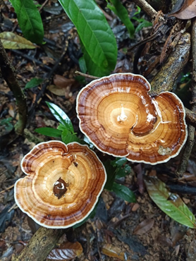 ชื่อสามัญ : เห็ดกรวยทองตะกู ชื่อวิทยาศาสตร์ : Microporus xanthopus แหล่งที่อยู่ : ขึ้นบนกิ่งไม้ร่วงและขอนไม้ที่ตายแล้ว สถานที่เก็บตัวอย่าง : ป่าอนุรักษ์พันธุกรรมพืช มหาวิทยาลัยราชภัฏรำไพพรรณี วันที่เก็บตัวอย่าง : 08/04/64 การเจริญเติบโต : ดอกเดี่ยวหรือขึ้นเป็นกลุ่ม การใช้ประโยชน์ : เป็นผู้ย่อยสลายในระบบนิเวศ และไม่มีข้อมูลว่ารับประทานได้หรือไม่ พิกัด : เส้นทางเดินป่าพรุ (25 m ตรงข้ามกับฐาน) และเส้นทางเดินป่าบก (พบได้เกือบทุกระยะตลอดเส้นทาง) ฐานข้อมูลสารพันธุกรรม : https://www.ncbi.nlm.nih.gov/ ข้อมูลเพิ่มเติม : - Captive_Cultivated : ไม่อยู่ Accession number : รอการตีพิมพ์ ข้อมูลวงศ์เห็ด : Polyporaceae ลักษณะทั่วไป : ดอกเห็ดลักษณะรูปกรวย บริเวณปากกว้าง 2.5-11.5 เซนติเมตร ขอบโดยรอบเรียบ ริมขอบดอกเห็ดจะมีสีขาวรอบวงดอก ผิวเรียบมันวาว ดอกเห็ดจะสีน้ำเข้มจนถึงสีเหลืองนวลอ่อน เนื้อดอกเห็ดเหนียว แข็ง บาง ก้านจะติดกับขอนไม้ที่ดอกเห็ดเจริญเติบโต รูปทรงกระบอกขนาด 1.5-3.5 X 0.2-0.4 เซนติเมตร ผิวเรียบ มัน สีน้ำตาล โคนก้านแผ่เป็นแป้นวงกลมเล็ก ๆ เนื้อแน่น เหนียว
