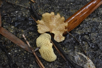 ชื่อสามัญ : เห็ดรังผึ้ง ชื่อวิทยาศาสตร์ : Favolus sp. แหล่งที่อยู่ : บนต้นไม้ที่มีชีวิต สถานที่เก็บตัวอย่าง : ป่าอนุรักษ์พันธุกรรมพืช มหาวิทยาลัยราชภัฏรำไพพรรณี วันที่เก็บตัวอย่าง : 12/07/64 การเจริญเติบโต : เจริญเป็นกลุ่มหรือดอกเดี่ยว การใช้ประโยชน์ : เป็นผู้ย่อยสลายในระบบนิเวศ และไม่มีข้อมูลว่ารับประทานได้หรือไม่ พิกัด : เส้นทางเดินป่าบก (100 m) และเส้นทางเดินป่าพรุ (125 m) ฐานข้อมูลสารพันธุกรรม : https://www.ncbi.nlm.nih.gov/ Captive_Cultivated : ไม่อยู่ Accession number : รอการตีพิมพ์ ข้อมูลวงศ์เห็ด : Polyporaceae ลักษณะทั่วไป : ลักษณะของหมวกเห็ดมีรูปทรงคล้ายไตหรือรูปพัด ความกว้าง 5-20 มิลลิเมตร ดอกเห็ดมีสีขาวค่อนไปทางน้ำตาลอ่อน ผิวด้านบนของดอกเห็ดเป็นปมนูนขนาดเล็ก ๆ หรือคล้ายตาข่ายนูน รูภายใต้หมวกเห็ดเป็นรูปหกเหลี่ยมหรือคล้ายรูปรังผึ้ง ขนาด 1-2 มิลลิเมตร มีจำนวนโดยประมาณ 12-18 รู มีสีเหลืองหรือค่อนข้างน้ำตาลอ่อน ก้านสั้นมากเห็นเป็นตุ่มขนาดเล็ก ๆ ติดทางด้านข้างกับหมวกแนบไปกับไม้ สีเดียวกับหมวก
