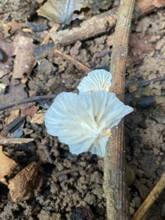 ชื่อสามัญ : - ชื่อวิทยาศาสตร์ : Marasmius palmivorus แหล่งที่อยู่ : ก่อโรคพืช เกิดกระจายจำนวนมากบนกิ่งไม้ที่ตายแล้ว สถานที่เก็บตัวอย่าง : ป่าอนุรักษ์พันธุกรรมพืช มหาวิทยาลัยราชภัฏรำไพพรรณี วันที่เก็บตัวอย่าง : 12/07/64 การเจริญเติบโต : เจริญแบบซ้อนกัน การใช้ประโยชน์ : เป็นผู้ย่อยสลายในระบบนิเวศ และไม่มีข้อมูลว่ารับประทานได้หรือไม่ พิกัด : เส้นทางเดินป่าบก (240 m) ฐานข้อมูลสารพันธุกรรม : https://www.ncbi.nlm.nih.gov/ Captive_Cultivated : ไม่อยู่ Accession number : รอการตีพิมพ์ ข้อมูลวงศ์เห็ด : Marasmiaceae ลักษณะทั่วไป : ลักษณะของหมวกเห็ดเป็นรูปชามคว่ำ หรือระฆังคว่ำ ความกว้างประมาณ 1 – 3.5 เซนติเมตร ตรงกลางของหมวกเห็ดจะบุ๋ม พื้นผิวของหมวกเห็ดคล้ายมีเส้นขนปกคลุม สีขาว แผ่นบาง โปร่งแสง ขอบหยักไม่เป็นระเบียบ บริเวณครีบ จะมีลักษณะเรียวลงไปจนติดก้าน เรียงห่าง ซึ่งระหว่างครีบนั้นจะมีเส้นเชื่อมสานกันคล้ายเป็นร่างแห สีขาว ส่วนก้านจะมีรูปทรงกระบอก ขนาด 1 – 2.5 x 0.1 – 0.2 เซนติเมตร บริเวณโคนมีขนาดเล็กกว่าปลายก้าน พื้นผิวเรียบ สีขาวและสามารถเปลี่ยนเป็นสีน้ำตาลอ่อนเมื่อแก่ เนื้อเหนียว โค้งงอได้ ภายในของก้านจะกลวง และสปอร์มีลักษณะรูปรีโค้งเล็กน้อย มีขนาด 10 – 12 x 3.5 – 5 ไมโครเมตร ผิวเรียบ ผนังบาง และรอยพิมพ์สีขาว