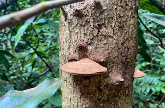 ชื่อสามัญ : - ชื่อวิทยาศาสตร์ : Ganoderma sp. แหล่งที่อยู่ : บนต้นไม้ที่มีชีวิต สถานที่เก็บตัวอย่าง : ป่าอนุรักษ์พันธุกรรมพืช มหาวิทยาลัยราชภัฏรำไพพรรณี วันที่เก็บตัวอย่าง : 12/07/64 การเจริญเติบโต : เจริญเป็นดอกเดี่ยว การใช้ประโยชน์ : เป็นผู้ย่อยสลายในระบบนิเวศ และไม่มีข้อมูลว่ารับประทานได้หรือไม่ พิกัด : เส้นทางเดินป่าบก (175 m) ฐานข้อมูลสารพันธุกรรม : https://www.ncbi.nlm.nih.gov/ Captive_Cultivated : ไม่อยู่ Accession number : รอการตีพิมพ์ ข้อมูลวงศ์เห็ด : Ganodermataceae ลักษณะทั่วไป : ลักษณะของดอกเห็ดคล้ายรูปพัดหรือครึ่งวงกลม ขนาดของดอกเห็ดยาวประมาณ 35-50 มิลลิเมตร กว้าง 45-75 มิลลิเมตร หนา 5-8 มิลลิเมตร ดอกเห็ดจะมีสีดำหรือสีน้ำตาล พื้นผิวของดอกเห็ดส่วนด้านบนเรียบเป็นมันหรือเป็นเคลือบเงา บนดอกเห็ดมีร่องเป็นแถบวงกลม ขอบหมวกเมื่อมองจากด้านบนจะเรียบ หรือเป็นหยักห่างๆ เนื้อของดอกเห็ดมีความแข็งและเหนียวมาก