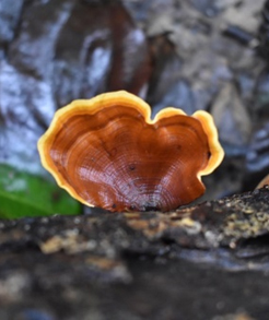 ชื่อสามัญ : หางไก่งวงปลอม เห็ดใบตองแห้ง ชื่อวิทยาศาสตร์ : Stereum ostrea แหล่งที่อยู่ : เป็นปรสิตของต้นไม้มีชีวิต และเจริญบนกิ่งไม้หรือขอนไม้ที่ตายแล้ว สถานที่เก็บตัวอย่าง : ป่าอนุรักษ์พันธุกรรมพืช มหาวิทยาลัยราชภัฏรำไพพรรณี วันที่เก็บตัวอย่าง : 10/10/64 การเจริญเติบโต : เจริญแบบเป็นกลุ่ม การใช้ประโยชน์ : ก่อโรคในพืช เป็นผู้ย่อยสลายในระบบนิเวศ และมีรายงานว่ารับประทานไม่ได้ พิกัด : เส้นทางเดินป่าบก (80 m) และเส้นทางเดินป่าพรุ (25 m) ฐานข้อมูลสารพันธุกรรม : https://www.ncbi.nlm.nih.gov/ Captive_Cultivated : ไม่อยู่ Accession number : รอการตีพิมพ์ ข้อมูลวงศ์เห็ด : Stereaceae ลักษณะทั่วไป : ลักษณะของดอกเห็ดมีลักษณะคล้ายรูปครึ่งวงกลม หรือรูปพัด ขนาดความกว้าง 2-15× 2-6 เซนติเมตร สีของดอกเห็ดมีสีน้ำตาลแดงสลับกับสีเหลือง เรียงสลับเป็นแนว มันวาวพื้นผิวเรียบ ขอบของดอกเห็ดเรียบ สีของขอบดอกเห็ดจะมีสีที่อ่อนกว่าบริเวณอื่น เนื้อของดอกเห็ดเหนียว มีความบาง สีเนื้อภายในมีสีน้ำตาลอมเหลือง ไม่มีก้าน จะเจริญติดกับพื้นที่ยึดเกาะ