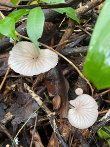 ชื่อสามัญ : - ชื่อวิทยาศาสตร์ : Gerronema strombodes แหล่งที่อยู่ : กิ่งไม้ ขอนไม้ที่ตายแล้ว สถานที่เก็บตัวอย่าง : ป่าอนุรักษ์พันธุกรรมพืช มหาวิทยาลัยราชภัฏรำไพพรรณี วันที่เก็บตัวอย่าง : 10/10/64 การเจริญเติบโต : ดอกเดี่ยวรวมเป็นกลุ่ม การใช้ประโยชน์ : เป็นผู้ย่อยสลายในระบบนิเวศ และไม่มีข้อมูลว่ารับประทานได้หรือไม่ พิกัด : เส้นทางเดินป่าบก (150 m) และเส้นทางเดินป่าพรุ (130 m) ฐานข้อมูลสารพันธุกรรม : https://www.ncbi.nlm.nih.gov/ Captive_Cultivated : ไม่อยู่ Accession number : รอการตีพิมพ์ ข้อมูลวงศ์เห็ด : Tricholomataceae ลักษณะทั่วไป : ลักษณะของดอกเห็ดเป็นแบบรูปทรงกรวย ความกว้าง 30-60 มิลลิเมตร ลักษณะดอกจะเป็นแนวร่องตั้งแต่กลางดอกไปจนถึงริมขอบ ผิวด้านบนของดอกเห็ดเรียบเนียน ริมขอบม้วนเข้าเล็กน้อย พื้นผิวของก้านดอกเห็ดเป็นแบบผิวเรียบ รูปทรงกระบอก ความยาวของก้านประมาณ 40 มิลลิเมตร ด้านในของก้านดอกกรวง ส่วนด้านใต้ดอกผิวเรียบหรือเป็นแนวร่อง เนื้อเยื่อขณะสดจะบางและนิ่ม
