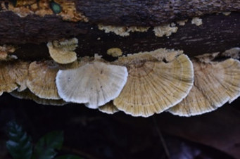ชื่อสามัญ : - ชื่อวิทยาศาสตร์ : Coriolopsis caperata แหล่งที่อยู่ : ขอนไม้ผุ สถานที่เก็บตัวอย่าง : ป่าอนุรักษ์พันธุกรรมพืช มหาวิทยาลัยราชภัฏรำไพพรรณี วันที่เก็บตัวอย่าง : 10/10/64 การเจริญเติบโต : เจริญเป็นกลุ่ม การใช้ประโยชน์ : เป็นผู้ย่อยสลายในระบบนิเวศ และไม่มีข้อมูลว่ารับประทานได้หรือไม่ พิกัด : เส้นทางเดินป่าบก (100 m) และเส้นทางเดินป่าพรุ (55 m) ฐานข้อมูลสารพันธุกรรม : https://www.ncbi.nlm.nih.gov/ Captive_Cultivated : ไม่อยู่ Accession number : รอการตีพิมพ์ ข้อมูลวงศ์เห็ด : Polyporaceae ลักษณะทั่วไป : ลักษณะดอกเห็ดมีรูปร่างคล้ายพัด ความกว้างประมาณ 2-5 เซนติเมตร เนื้อของดอกเห็ดจะมีความแข็งเหมือนไม้ และมีความเหนียว ผิวบริเวณด้านบนและด้านใต้ของดอกเห็ดไม่ค่อยเรียบ บริเวณขอบของดอกเห็ดจะมีสีขาว หากมองจากด้านข้างจะเป็นคลื่น มีการโค้งขึ้นลงตลอดทั้งดอกเห็ด ไม่มีก้าน การเจริญของดอกเห็ดจะเจริญติดกับพื้นที่ที่ยึดเกาะ