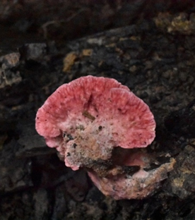ชื่อสามัญ : - ชื่อวิทยาศาสตร์ : Cyanosporus sp. แหล่งที่อยู่ : พบบนขอนไม้ผุ สถานที่เก็บตัวอย่าง : ป่าอนุรักษ์พันธุกรรมพืช มหาวิทยาลัยราชภัฏรำไพพรรณี วันที่เก็บตัวอย่าง : 10/10/64 การเจริญเติบโต : เจริญเป็นดอกเดี่ยว การใช้ประโยชน์ : เป็นผู้ย่อยสลายในระบบนิเวศ และไม่มีข้อมูลว่ารับประทานได้หรือไม่ พิกัด : เส้นทางเดินป่าบก (355 m) ฐานข้อมูลสารพันธุกรรม : https://www.ncbi.nlm.nih.gov/ Captive_Cultivated : ไม่อยู่ Accession number : รอการตีพิมพ์ ข้อมูลวงศ์เห็ด : Unranked ลักษณะทั่วไป : ดอกมีลักษณะคล้ายพัด มีเนื้อนิ่มฉ่ำน้ำ มีความหนานุ่ม สีชมพู ด้านล่างดอกมีลักษณะเป็นรูขนาดเล็กสีขาวจนถึงสีครีม