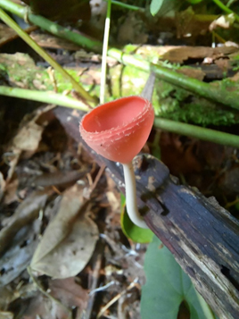 ชื่อสามัญ : เห็ดถ้วยขนสั้น เห็ดถ้วยแชมเปญ ชื่อวิทยาศาสตร์ : Cookeina sulcipes แหล่งที่อยู่ : บริเวณพื้นดิน และขอนไม้ที่ตายแล้ว สถานที่เก็บตัวอย่าง : ป่าอนุรักษ์พันธุกรรมพืช มหาวิทยาลัยราชภัฏรำไพพรรณี วันที่เก็บตัวอย่าง : 01/09/63 การเจริญเติบโต : ดอกเดี่ยว การใช้ประโยชน์ : เป็นผู้ย่อยสลายในระบบนิเวศ และมีรายงานว่ารับประทานได้ พิกัด : เส้นทางเดินป่าบก (200 m) ฐานข้อมูลสารพันธุกรรม : https://www.ncbi.nlm.nih.gov/ ข้อมูลเพิ่มเติม : - Captive_Cultivated : ไม่อยู่ Accession number : รอการตีพิมพ์ ข้อมูลวงศ์เห็ด : Sarcoscyphaceae ลักษณะทั่วไป : ดอกเห็ดรูปถ้วยหรือกรวย เส้นผ่าศูนย์กลาง 10-35 มิลลิเมตร ลึก 10-20 มิลลิเมตร มีสีแดงถึงส้ม ด้านในสีเข้มกว่าด้านนอก แล้วค่อย ๆ จางลงจนถึงปลายก้าน ผิวบริเวณด้านบนเรียบ ขอบดอกเห็ดจะมีขนสั้น ๆ ล้อมรอบประมาณ 2-3 แถว ส่วนก้านมีลักษณะทรงกระบอก ความยาว 15-38 มิลลิเมตร เส้นผ่าศูนย์กลาง 1-3 มิลลิเมตร มีสีขาวทั่วก้านติดตรงกลางของดอกเห็ด พื้นผิวของก้านมีขนสั้น ๆ ทั่วก้าน